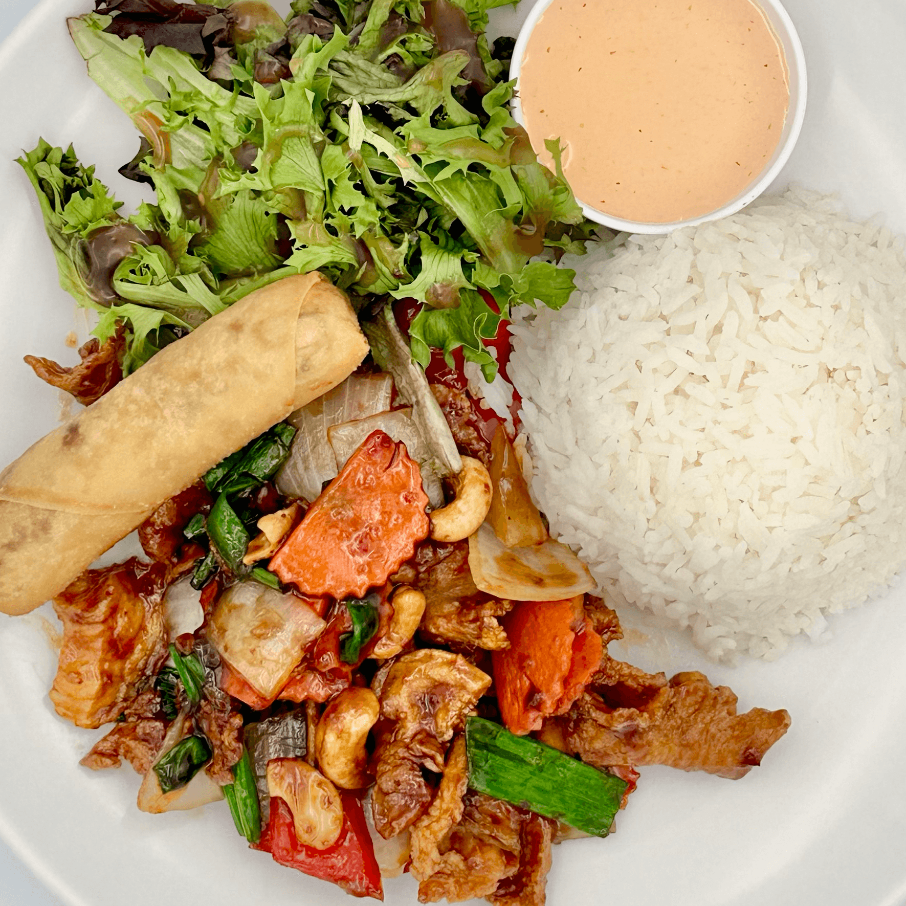 Pan fried cashew nuts, bell peppers, carrots, scallions and onion. Choice of meat. Served with jasmine rice, green salad and an awesome crispy roll