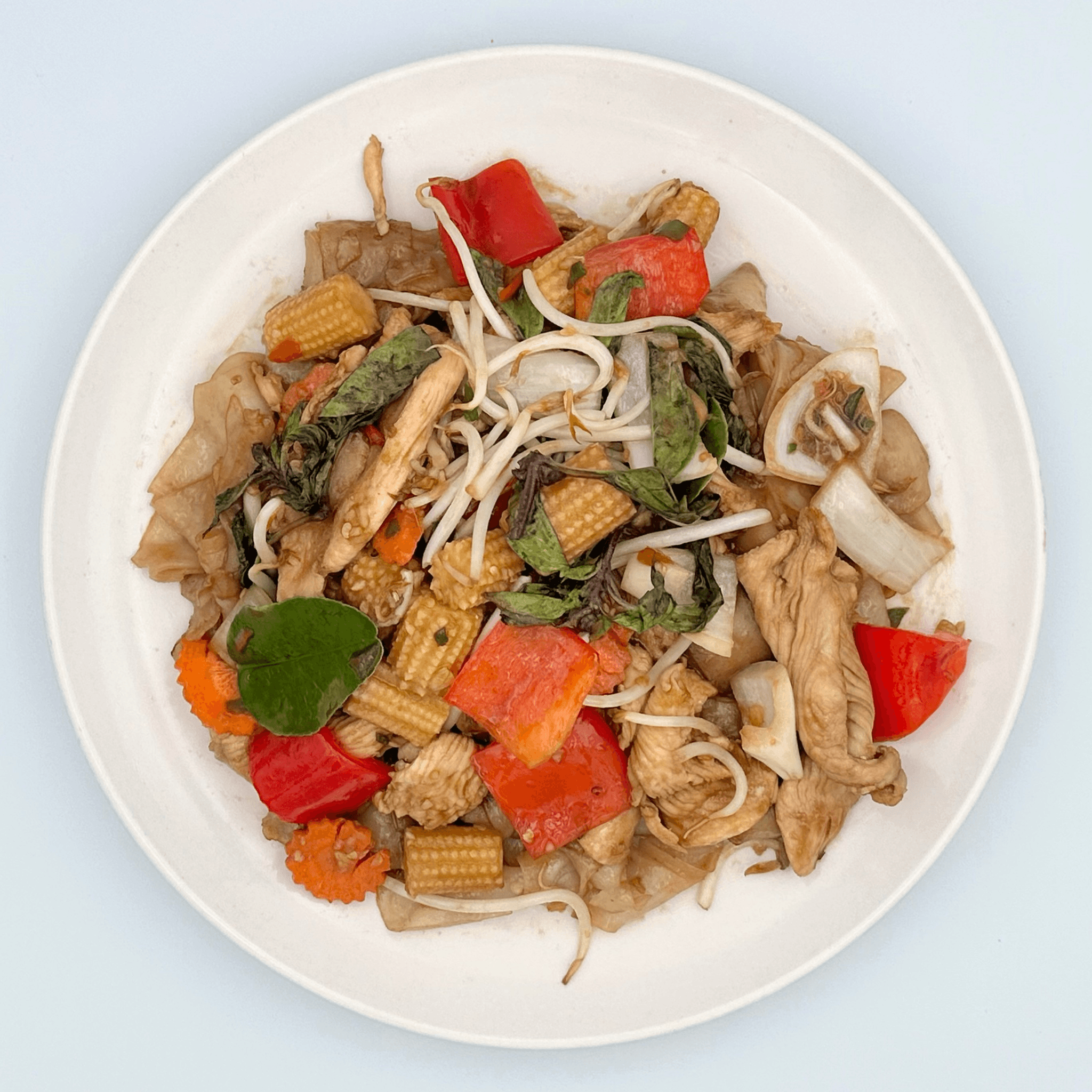 (Drunken noodles) Stir-fried flat rice noodles, onions, bean sprouts, bell peppers, baby corn and basil. Choice of meat