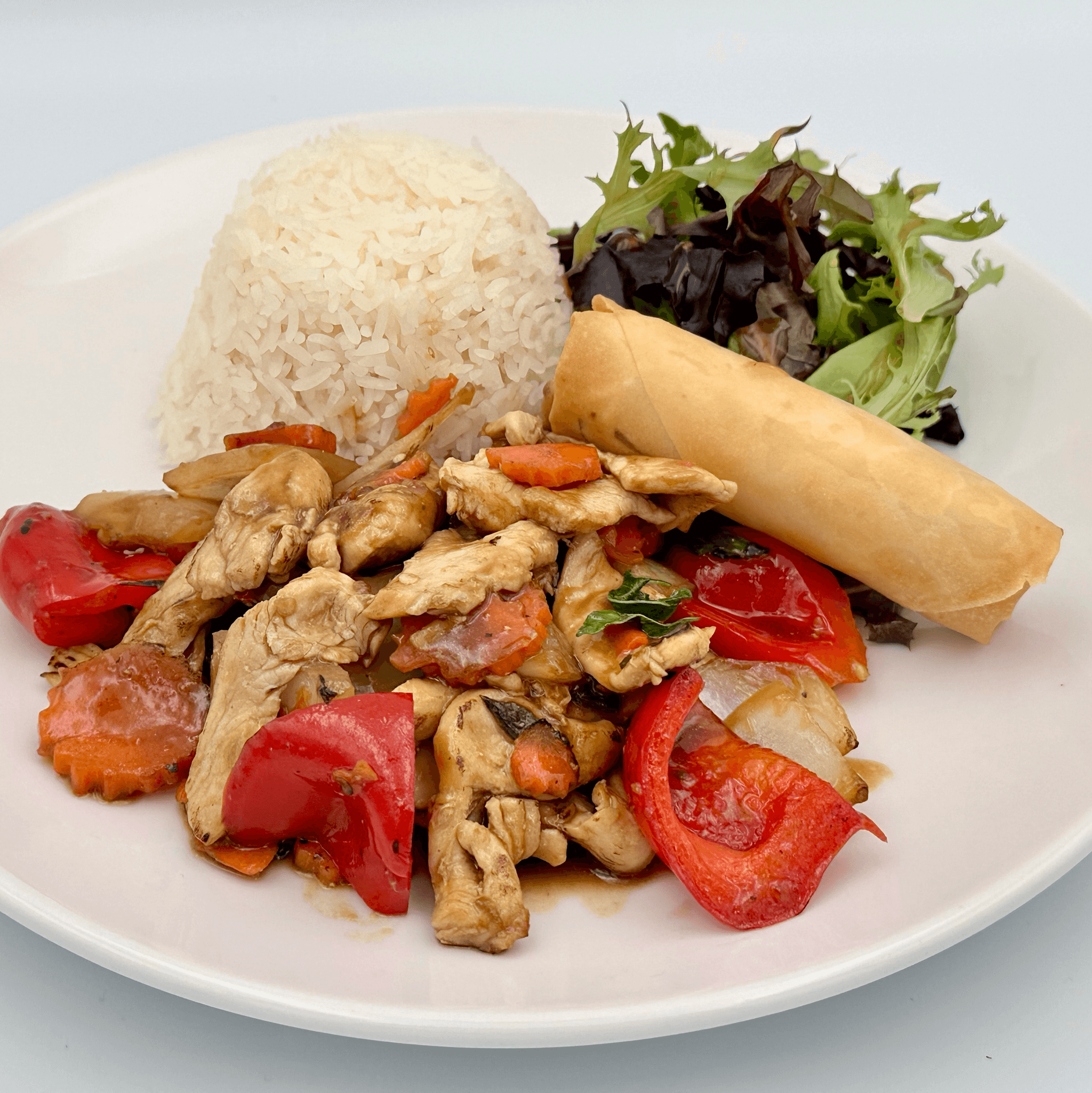 Spicy pan fried bell peppers, carrots, onions and basil. Choice of meat. Served with jasmine rice, green salad and an awesome crispy roll