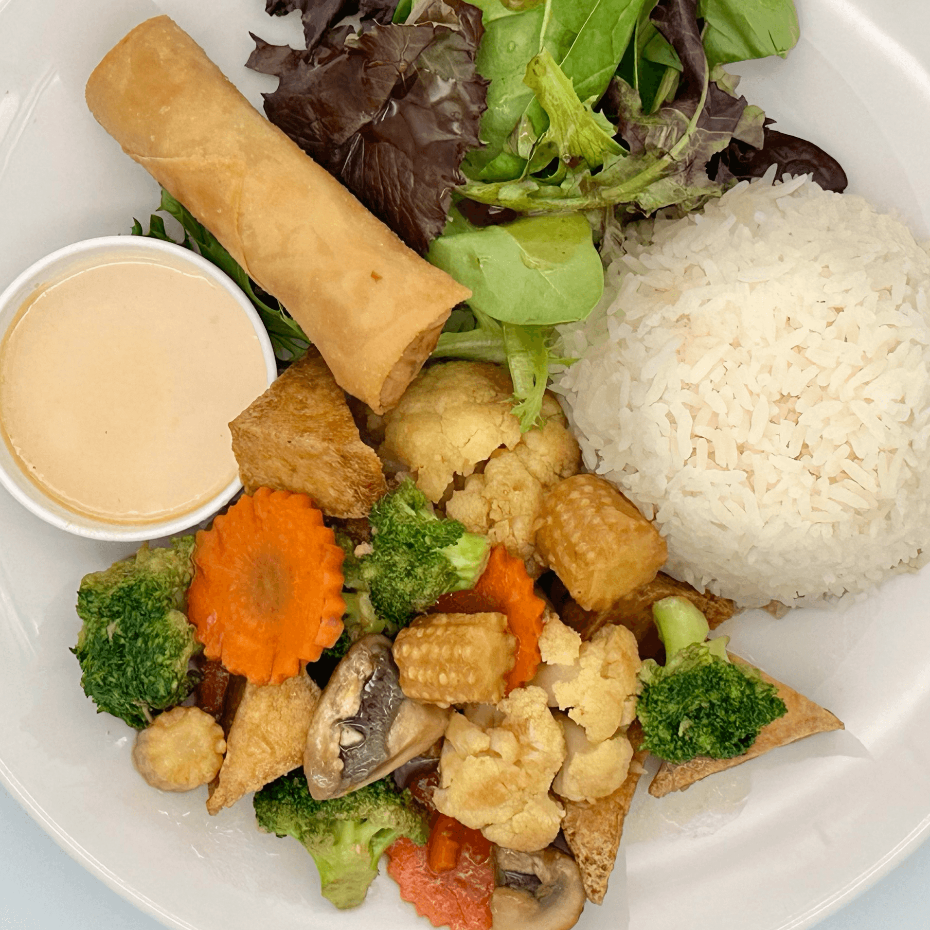 Pan fried broccoli, cauliflower, carrots, baby corn, and mushrooms. Choice of meat. Served with jasmine rice, green salad and an awesome crispy roll